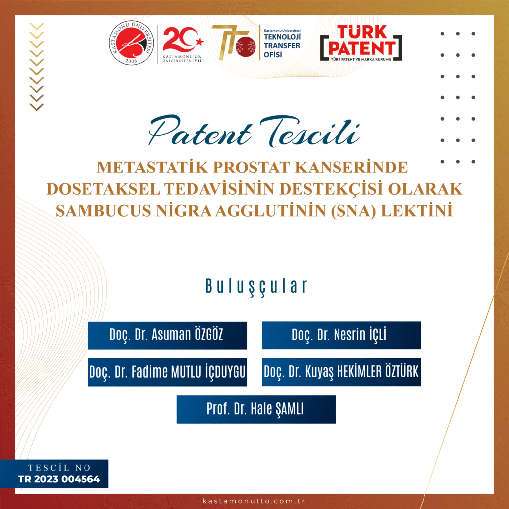 Kastamonu Üniversitesi hak sahipliğinde başvurusu yapılan; Tıp Fakültesi Dahili Tıp Bilimleri Bölümü öğretim üyesi Doç. Dr. Asuman ÖZGÖZ, Sağlık Bilimleri Fakültesi Beslenme ve Diyetetik Bölümü öğretim üyesi Doç. Dr. Nesrin İÇLİ ve farklı üniversitelerden buluşçuların yer aldığı “ Metastatik Prostat Kanserinde Dosetaksel Tedavisinin Destekçisi Olarak Sambucus Nigra Agglutinin (SNA) Lektini” başlıklı patent, Türk Patent ve Marka Kurumu tarafından tescil edilmiştir. Buluşçularımızı tebrik eder, başarılarının devamını dileriz.